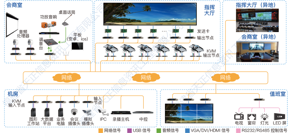 基于IP 网络化的分布式可视化技术是将 DV1、HDM、SDIVGA 等各种不同格式的视频信号和 USB.232、485等各种不同格式的控制信号通过1台输入节点设备统一进行编码转换为可以通过网络进行传输的格式,系统集合了可视化管理、KVM 坐席协作、影像切换、大屏拼接、远距离传输、音视频矩阵、控制管理、投影融合等强大系统功能,同等功能场景下,有效简化设备和线路。