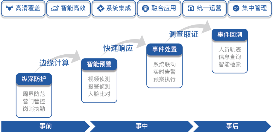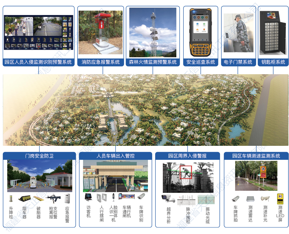 以园门、周界、园区、道路、重要区域场所部位为目标,部署视频监控、应急报警、入侵报警、人员车辆出入、电子门禁等安全管控系统。综合运用人脸车牌识别和智能分析技术实现园区人、车、物和行为的精准识别和黑名单及异常行为告警,授权人员车辆秒级通行,夜间如白昼的彩色画质监看。并通过定制开发智慧安防软件平台,利用大数据分析可视化技术,将所有安防子系统的信息进行关联和分析,实现集中展示风险目标、人车状态、告警处置等综合态势,实现园区安防管理从事后追溯向事先感知、事后分析